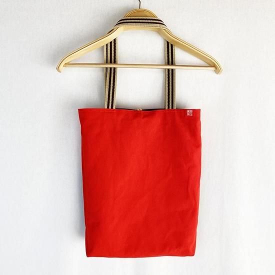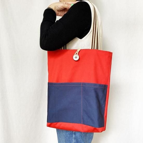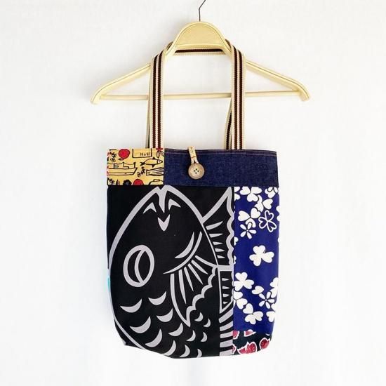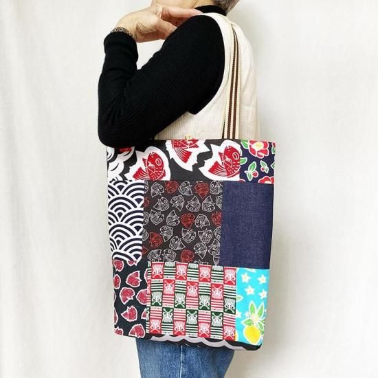 岩川旗店の手拭いや、染めた生地をふんだんにちりばめたパッチワークトートバッグです。また、リバーシブルになっているので、内側を裏返しても使えます。